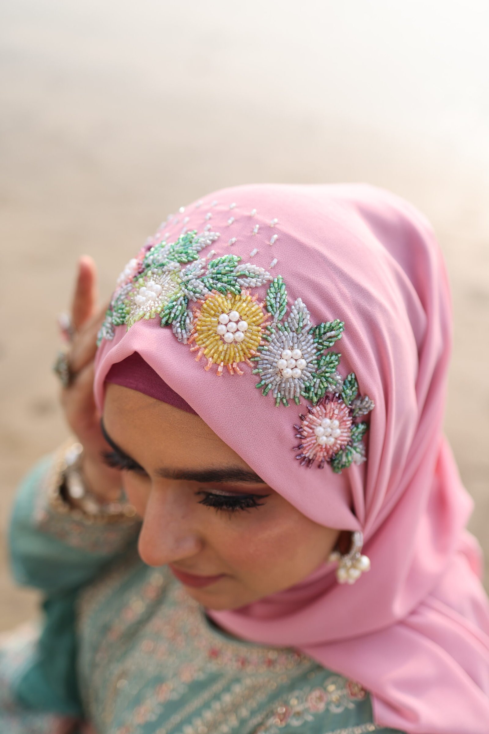 A timeless bridal hijab designed to add elegance and grace to your special day. This piece features intricate hand embellishments with cut dana, sequins, moti, pearls, zardozi, and resham dhaaga work, beautifully arranged along the centre panel to create a delicate and luxurious finish.